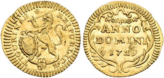This specimen was lot 5325 in Sincona sale 80 (Zurich, October 2022), where it sold for 1,300 CHF (about US$1,558 including buyer's fees). The catalog description[1] noted, "SWITZERLAND | Zurich | Stadt und Kanton, Vierteldukat 1729, Zürich. Rare. About extremely fine." This scarce type was struck 1718-67 along with double (Fr-485a), half (Fr-487a) and single ducats (Fr-486a). In 1798, the canton of Zurich was forcibly incorporated into the Helvetic Republic.