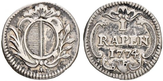 This type was struck in copper 1774, 1787-96 and is common in that metal. Ten rappen made a batzen and forty batzen made a thaler.