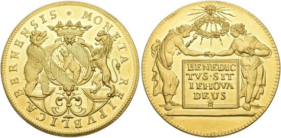"SWITZERLAND | Bern | Stadt und Kanton. 5 Dukaten o. J. (um 1710), Bern. Gekrönte Wappenkartusche, gehalten von einem Löwen und einem Bären, die auf Podesten stehen. Darunter das Münzzeichen D B für den Stempelschneider De Beyer. Rv. Mann und Frau reichen sich über einem Altar die Hand, darüber Kranz und strahlende Sonne in Form eines Gesichtes. Sehr selten. Fast FDC. Prachtvolle Erhaltung. (Switzerland, canton of Bern, undated quintuple ducat from circa 1710, Bern mint. Obverse: crowned arms in a cartouche, supported by a lion and a bear standing on a pedestal, engraver's initials below; reverse: a man and a woman shake hands over an altar, wreath and shining sun above. Very rare, About uncirculated, Magnificent condition.)"