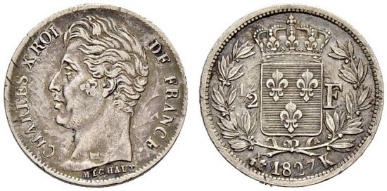 "Charles X. 1824-1830 1/2 Franc 1827. K, Bordeaux. Fast vorzüglich. Überprägungsspuren. (France, Charles X, 1824-K, half franc of 1827, Bordeaux mint. Choice extremely fine, rim nicks.)"