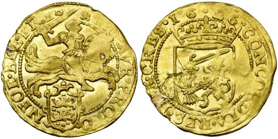 "NEDERLAND, FRIESLAND, Provincie, AV halve grote gouden rijder, 1626. Vz/ Ridder te paard n.r. met zwaard boven gekroond provinciewapen. Kz/ Gekroond Generaliteitswapen. Zeer zeldzaam. Zwakke slag. Gerestaureerd (gestopte barst). Zeer Fraai. (Netherlands, province of Friesland, gold half cavalier of 1626. Obverse: mounted knight charges right over the arms of the province; reverse: crowned arms of the Generality. Very rare, weakly struck, repaired--hole plugged, Very Fine.)"