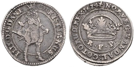 This specimen was lot 2346 in Sincona sale 20 (Zurich, October 2014), where it did not sell. The catalog description[1] noted, "Krone 1624. Sehr schön. (very fine.)" Danish crowns of the seventeenth century range from the scarce to the obscenely rare. Either they were melted extensively or the poverty of the king prevented large issues or both. This type of 1624-25 is fairly common. It is on the light side to be considered a thaler but we include it as a nod to Davenport. The mintmark is the club or clover after the date.