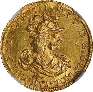 "Shimmering Multiple Ducat with Connection to the Danish Gold Coast in Africa, DENMARK. 2 Ducats, 1688. Copenhagen Mint. Christian V. NGC MS-63+. Obverse: Draped bust right, wearing plumed helmet and Order of the White Elephant; Reverse: Aerial view of Fort Christiansborg (Osa Castle) on an island and wi[th] large, billowing banner flying atop the turret. A VERY RARE and sharply struck specimen, this highly Choice example exudes a near-prooflike nature with its resoundingly brilliant fields and lightly frosted devices. A fairly large die crack is noted on the reverse, though it is easily disregarded, as it clearly happened at the beginning of the mintage for the type, with seemingly all other known examples displaying it as well. Furthering its historical appeal that much more is the fact that it offers a bird's eye view of the Danish outpost on Africa's Gold Coast, Fort Christiansborg, located in what is now Ghana along the Gulf of Guinea."