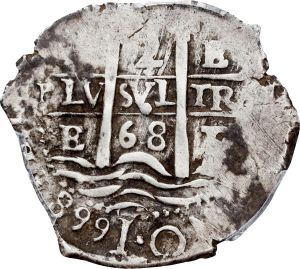 This specimen was lot 72109 in Stack's Bowers Collectors Choice Online Auction (Costa Mesa, CA, October 2024), where it sold for $312. The catalog description[1] noted, "BOLIVIA. Cob 2 Reales, 1668-P E. Potosi Mint. Charles II. PCGS EF-40. A moderately struck Cob with dark toning in the fields and some weak patches on both sides. Mintmark and assayer information is clear on the obverse, and the date appears twice, once with all four digits. From the S.P. Rutherford Collection." In 1652, the four and eight reales were redesigned to distinguish the reformed (full silver) product from the old, debased cobs. Assayer "E" (Antonio de Ergueta) was brought in to clean house and served 1650-79, well into the reign of Charles II, as here.