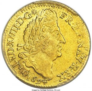 The first specimen was lot 30754 in Heritage sale 3064 (Chicago, April 2018), where it sold for $900. The catalog description[1] noted, "Louis XIV gold Louis d'or 1694-A AU55 PCGS, Paris mint. Reused Flan. Premium quality, with most of the previous coin disappearing due to a bold strike. Worthy of a premium as such." This type, known as a louis d'or aux 4 L, was struck in France 1693-1700, mostly over older coins. Twenty-four mints contributed in 1694.