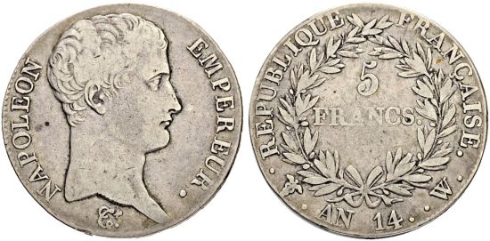 "I. Kaiserreich. Napoleon I. 1804-1815. 5 Francs An 14 W (1805/1806), Lille. Selten. Nur 13836 Exemplare geprägt. Attraktives sehr schön. (France, first empire, Napoleon I, 1804-15, five francs of the year 14, Lille mint. Rare. Only 13836 pieces struck, Attractive very fine.)"