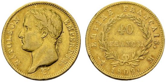 "40 Francs 1809. Toulouse Selten. Sehr schön. (empire of France, Napoleon I, forty francs of 1809, Toulouse mint, rare, very fine.)"