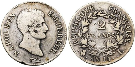 "FRANCE, Napoléon Ier (1804-1814), AR 2 francs, an 14L, Bayonne. Seulement 1210 p. frappées. Extrêmement rare. Beau. (empire of France, Napoleon I, 1804-14, two francs of the year 14, Bayonne mint, only 1,210 pieces struck. Extremely rare, Fine.)"