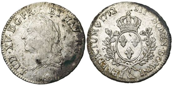 "FRANCE, Royaume, Louis XV (1715-1774), AR écu à la vieille tête, 1772 Q, Perpignan. D/ T. l. à g. R/ Ecu de France couronné, entre deux rameaux d'olivier. Rare. Taches d'oxydation. Beau à Très Beau/Très Beau. Dans le Trouvaille de Labuissière. (kingdom of France, Louis XV, 1715-74, silver écu of the old head of 1772, Perpignan mint. Obverse: laureate head left; reverse: crowned arms of France between two olive branches. Rare, stained by corrosion, Fine - Very Fine/Very Fine.)"