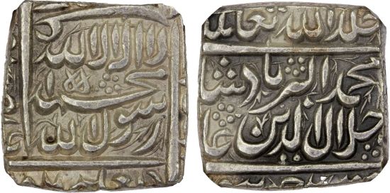 This specimen was lot 2476 in Stephen Album sale 50 (Santa Rosa, CA, September 2024), where it sold for $660. The catalog description[1] noted, "MUGHAL: Akbar I, 1556-1605, AR square rupee, Jaunpur, AH(9)86, mint below obverse, date to left below reverse; stunning strike, NGC graded MS62." This type was struck AH 985-989 and is listed as fairly common. Jaunpur is in central Hindustan near Allahabad and Benares and would later be ruled by the Nawab of Awadh.