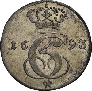 This specimen was lot 10300 in Stack's Bowers Collectors Choice Online Auction (Costa Mesa, CA, February 2025), where it sold for €840 (about US$876). The catalog description[1] noted, "DENMARK. 4 Skilling, 1693. Gluckstadt Mint. Christian V. NGC AU-58. Nice condition for type. From the L. E. Bruun Collection." This type was struck in Gluckstadt 1693-94. Christian V was king of Denmark and duke of Schleswig-Holstein. Two mark was half a krone or one-third speciedaler.