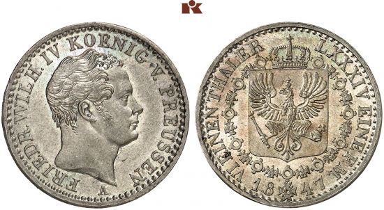 "BRANDENBURG-PREUSSEN, PREUSSEN, KÖNIGREICH, Friedrich Wilhelm IV. 1840-1861. 1/6 Taler 1847, A. Vorzüglich. Exemplar der Auktion Möller 24, Kassel 1999, Nr. 867. (Germany, kingdom of Prussia, Frederick William IV, 1840-61, one sixth thaler of 1847. Extremely fine.)"