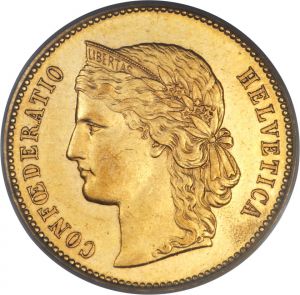 This specimen was lot 30673 in Heritage sale 3040 (Chicago, April 2015), where it sold for $5,757.50. The catalog description[1] noted, "Confederation gold 20 Francs 1888-B AU58 PCGS, Bern mint. One of the rarest, collectible dates in this Laureate head series, the present offering displays incredibly lustrous, harvest-gold surfaces that emit an appreciable amount of reflectivity within the fields. Very minimally circulated, the devices are still sharp from an impressive strike, and show only faint wear across the highpoints, while insignificant wisps across the bust and within the open areas are essentially unremarkable and barely visible to the unaided eye. This selection is currently the third finest certified example of this date with only two other coins graded finer, further confirming the scarcity of this item and the rarity of its condition. A truly remarkable specimen, worthy of great attention and a premium bid. From The Law Collection." This Swiss twenty francs conforms to the standard of the Latin Monetary Union, where twenty francs = 6.45 g, 0.900 fine gold. Switzerland continued to use this standard even after France, its originator, abandoned it after World War One. This type was struck 1886-96; an earlier issue (KM 31.1) of 1883 had a reeded edge.