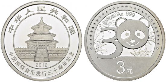 "EDELMETALL-AUKTION | CHINA | Volksrepublik, 3 Yuan 2012. The commemorative silver coin for the 30th anniversary of the issuance of the Chinese panda gold coin. 1/4 OZ. Feingewicht total: 7.77 Gramm. Fast FDC. In Originalschachtel mit Zertifikat. (peoples republic of CHina, three yuan of 2012, on the 30th anniversary of the panda coin. About uncirculated, In original box with certificate.)"