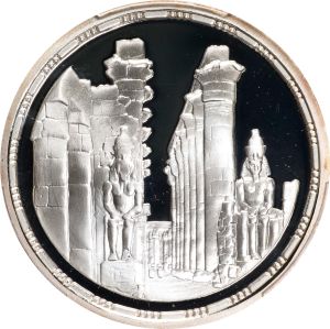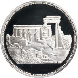 The first specimen was lot 1645 in Stephen Album sale 30 (Santa Rosa, CA, January 2018), where it sold for $2,350. The catalog description[1] noted, "EGYPT: AR 5 pounds, 1994/AH1415, Philae temple, unlisted by KM, Proof, R." The second specimen was lot 1646 in Stephen Album sale 30 (Santa Rosa, CA, January 2018), where it sold for $2,585. The catalog description[1] noted, "EGYPT: AR 5 pounds, 1994/AH1415, Khosru temple, unlisted by KM, Proof, R." The third specimen was lot 38117 in Stack's Bowers NYINC sale (New York, January 2025), where it sold for $384. The catalog description[2] noted, "EGYPT. 5 Pounds, AH 1415/1994. PCGS PROOF-69 Deep Cameo. Horus's Temple, Edfu." The fourth specimen was lot 38119 in the same sale, where it sold for $660. The catalog description[2] noted, "EGYPT. 5 Pounds, AH 1415/1994. PCGS PROOF-69 Deep Cameo. Temple of Luxor." The fifth specimen was lot 38121 in in the same sale, where it sold for $312. The catalog description[2] noted, "EGYPT. 5 Pounds, AH 1415/1994. PCGS PROOF-68 Deep Cameo. Temple of Hathor." The sixth specimen was lot 3642 in Steve Album Auction 51 (Santa Rosa, CA, January 2025), where it sold for $90. The catalog description[3] noted, "EGYPT: Arab Republic, AR 5 pounds, 1994/AH1415, N-360809, Ancient Treasure Series, King Taharqa of Kush, an extraordinary example, NGC graded PF69 Ultra Cameo." These NCLT's are among dozens issued by the regime in 1994 and somehow the SCWC omitted them. We have borrowed the specification information from the similar KM 749 thru KM 757.