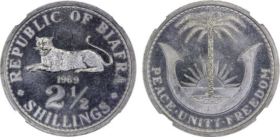 This specimen was lot 1194 in Steve Album Auction 51 (Santa Rosa, CA, January 2025), where it sold for $192. The catalog description[1] noted, "BIAFRA: Republic, 2½ shillings, 1969, a fantastic example, NGC graded MS66. Tied for finest graded at NGC." The suppression of the Biafran revolt was carried out with the maximum destruction of property and life and the region is today part of Nigeria.