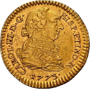 This specimen was lot 1278 in Sedwick Auction 37 (Winter Park, FL, May 2025), where it sold for $3,900. The catalog description[1] noted, "PERU, Lima, gold bust 1 escudo, Charles III, 1773 MJ, NGC UNC details / cleaned, ex-Almenara. Choice bold strike with full rims and nice luster, very faint hairlines on obverse. Pedigreed to the Almenara Collection." The "rat nose" bust of the king used 1763-71 was superseded by this bust used from 1772 until the king's death. While this type is scarce compared to Mexican or Colombian escudos, it is much more available than any previous type. Assayers JM and MJ are known for 1773. The implementation of a new bust was the occasion for a slight debasement from 0.917 fine gold to 0.901 fine.