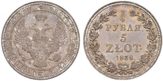 "¾ Roubles – 5 Zlotych 1838, St. Petersburg Mint, HГ. 75 roubles according to Ilijin!!! 40 roubles acc. to Trapeznikov!! Excessively rare as a proof!! The most legendary provenance from the famous collection of Count I. I. Tolstoy!! Eminent provenance! Cabinet piece. Magnificent proof with amazing patina. Collector’s note: 'RRR. Rather rare in GM. 12 063 pcs struck but was already before revolution at least 75 roubles worth. Proof” Ex famous auction Adolph Hess AG / Bank Leu & Co. AG 27, Lucerne, 14-16. 10. 1964, lot 1520 (a small paper tag from that auction with the lot number is enclosed hereto). The coins in that sale originated from the Virgil Brand collection Ex famous „Collection of Count I. I. Tolstoy. Russian Coins from 19th Century“. Adolph Hess auction № 142, 10th of March 1913, lot 1580! Because of its rarity such a coin was not in „Duplicates from the Imperial Coin Cabinet of the Hermitage in St. Petersburg'. Adolph Hess auction 132, 29th of May 1911! Because of its rarity such a coin was not in proof in the famous „Russian Coins from 19th and 20th Centuries. Collection of Duplicates from Russian Museums“, Adolph Hess auction 204, 18th of February 1931!"