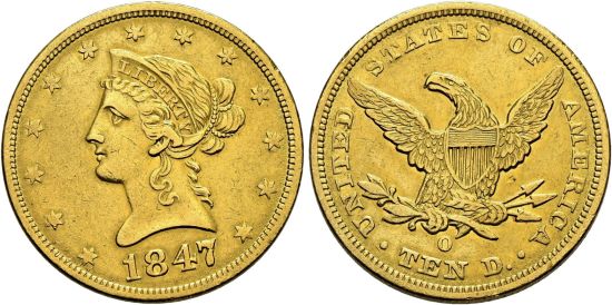 "USA, 10 Dollars 1847 O, New Orleans. Liberty head type. Sehr schön. (Very fine.)"