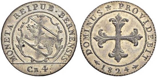 This type was struck 1818 and 1824 and is fairly common in circulated condition. It is catalogued as a batzen altho the coin is marked as a 4 kreuzer. Ten batzen made a frank and four franken made a thaler. The last Bernese coin is a rappen dated 1836. The confederation of 1848 ended cantonal issues.