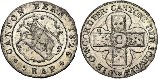 "SCHWEIZ Bern, Stadt und Kanton, Halbbatzen 1826, Bern. Ohne Perlkreis auf der Rückseite. Überprägt auf einen Halbbatzen von 1824. Selten. Vorzüglich-FDC. (Switzerland, canton of Bern, half batzen of 1826, Bern mint, without circle of pearls on the reverse, struck over a half batzen of 1824. Rare, Extremely Fine-Uncirculated.)"