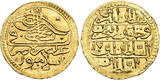 This specimen was lot 3726 in Sincona sale 83 (Zürich, May 2023), where it sold for 500 CHF (about US$669 including buyer's fees). The catalog description[1] noted, "TURKEY, 1 Zer-i mahbûb 1203 H./Jahr 17, Islambul (Istanbul). NGC MS65. Das durch NGC höchstbewertete Exemplar (zeri mahbub of AH 1203, year 17, Istanbul mint. Finest certified by NGC)." This type was struck years 10-19. It has a rather low catalog value but is usually found damaged from being removed from jewelry. The gold was the victim of frequent manipulation and the denominations changed names in a confusing manner. The SCWC lists zeri mahbubs, rumi altins, adli altins, yeni altins and hayriye altins for this period. Matters were regularized in the reign of Abdul Mejid, with gold coins issued in multiples of the kuruş.