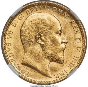 This specimen was lot 32271 in Heritage sale 3089 (Dallas, TX, January 2021), where it sold for $1,140. The catalog description[1] noted, "Australia. Edward VII gold Sovereign 1908-S MS64 NGC, Sydney mint. The sole finest example certified by NGC, and tied for the finest with a handful of others at PCGS. Bright, satiny surfaces with a scattering of small nicks prevent a gem designation." This date, from a type struck 1902-10 at Perth, Melbourne and Sydney (shown here), is common.