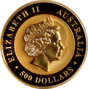 This specimen was lot 54024 in Stack's Bowers NYINC sale (New York, January 2024), where it sold for $4,800. The catalog description[1] noted, "AUSTRALIA. 500 Dollars, 2016-P. Perth Mint. Elizabeth II. GEM PROOF. Kimberley Sunrise type, with inset diamond. An enthralling gold issue, this radiant specimen dazzles with majestic brilliance and a sparkling nature emanating from the inset stone, representing the rising sun. Includes original packaging of issue, as well as certificate of authenticity."