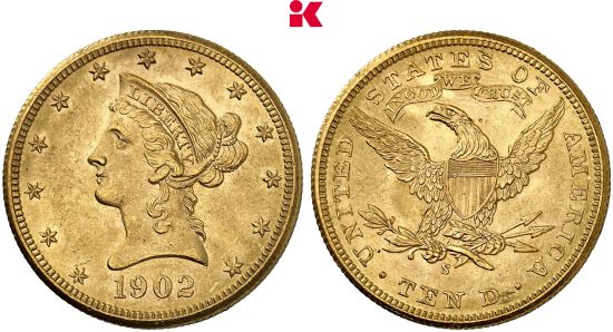 "MÜNZEN UND MEDAILLEN AUS ÜBERSEE · VEREINIGTE STAATEN VON AMERIKA, Föderation. 10 Dollars 1902 S, San Francisco. Liberty. 15,05 g Feingold. Mit Motto: "IN GOD WE TRUST". GOLD. Vorzüglich-Stempelglanz. Aus der Familiensammlung Mohr. (United States, ten dollars of 1853, San Francisco mint, Liberty head type, with motto. Extremely fine to uncirculated.)"