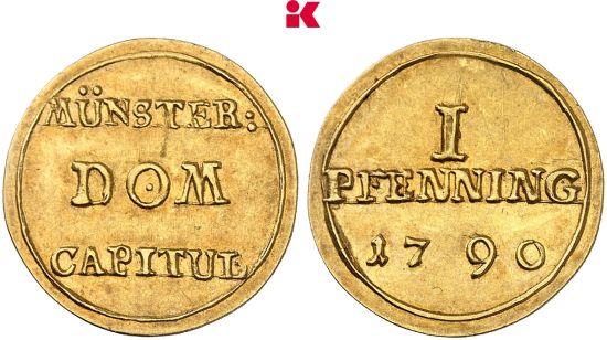 "DEUTSCHE MÜNZEN UND MEDAILLEN · MÜNSTER, DOMKAPITEL Goldabschlag von den Stempeln des Ku.-Pfennigs 1790. MÜNSTER : / DOM / CAPITUL//I / PFENNING / 1790. GOLD. Von größter Seltenheit. Kl. Bearbeitungsstelle am Rand (Henkelspur), vorzüglich. (Germany, bishopric of Münster, cathedral chapter, pfennig of 1790, struck in gold. Obverse: inscription; reverse: value and date. Extremely rare, a little tooling on the edge, extremely fine.)"