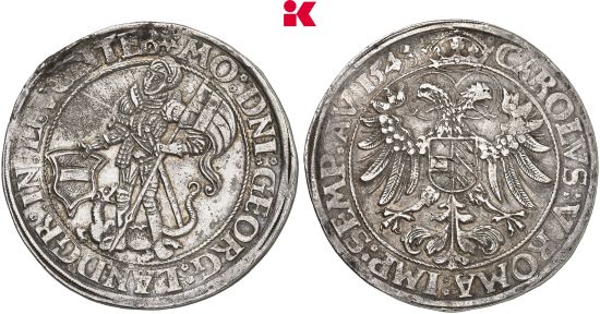 "DEUTSCHE MÜNZEN UND MEDAILLEN · LEUCHTENBERG, LANDGRAFSCHAFT Georg III., 1531-1555. Taler 1543, Pfreimd, mit Titel Karls V. Münzmeister Hans Fuchstaller. Münzzeichen Stern. Doppeladler mit Nimben. St. Georg mit Schild und Fahne steht v. v., unten der lebende Drache//Gekrönter Doppeladler mit Kopfscheinen, auf der Brust zweifeldiges Wappen (Österreich/Burgund). Leicht korrodiert, sehr schön +. (Germany, landgraviate of Leuchtenberg, George III, 1531-55, thaler of 1543, Pfreimd mint, struck in the name of Charles V. Obverse: St. George stands, holding a shield and flag from the front, below, the living dragon; reverse: crowned and nimbate double-headed eagle, on the chest the impaled arms of Austria and Burgundy. Lightly corroded, very fine or better.)"