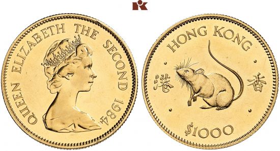 "HONG KONG, Elizabeth II, 1952-1997. 1.000 Dollars 1984. Jahr der Ratte. 14,65 g Feingold. GOLD. Stempelglanz. (Hong Kong, Elizabeth II, 1952-97, one thousand dollars of 1984, Year of the Rat. Uncirculated.)"