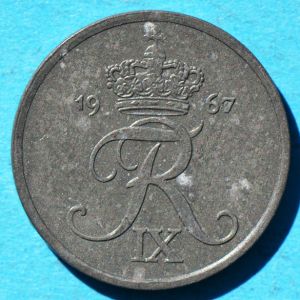 This specimen is a zinc one øre issued under King Frederik IX, and was issued 1956-1971, superseding a similar type of 1948-55. The privy mark (for Copenhagen) is shown as a small heart on the reverse, along with C and S, the initials of the mint officials.