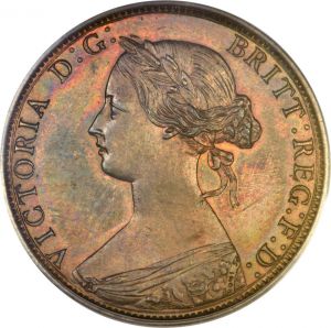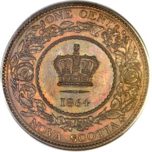 This specimen was lot 33845 in Heritage sale 3038 (Dallas, January 2015), where it sold for $1,997.50. The catalog description[1] noted, "Nova Scotia. Victoria Specimen Cent 1864 SP64 Brown PCGS. An illustrious example of this type with the portrait of Victoria virtually flawless. This date almost never appears in Specimen grade." Prior to confederation with Canada in 1867, the province of Nova Scotia issued half cents and cents 1861-64.