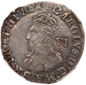 This specimen was lot 2693 in Goldberg sale 91 (Los Angeles, June 2016), where it sold for $411.25. The catalog description[1] noted, "Great Britain. Sixpence, ND NGC AU50. Charles I, 1625-1649. Mint mark, Crown (1634-38). Obverse: Crowned portrait of the king with no inner circle surrounding. Reverse: Crown over oval shield of arms. This is a pretty coin with a light blue tone, good surfaces, and little if any wear. The cameo portrait of the ill-fated king is exquisite. NGC graded AU-50." This undated sixpence could be any one of five different SCWC numbers (KM 94 thru 98) but since the catalog did not include photos, we are baffled. Charles' conflicts with Parliament and his subsequent inability to raise funds cramped the production of coin. When milled coinage was introduced in the 1670's, much of the hammered coin was called in and melted.