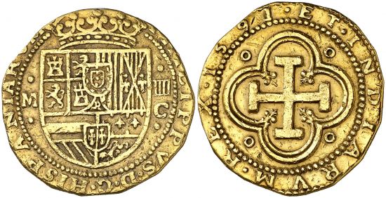 "1591. Felipe II. M (Madrid). C. 4 escudos. Golpecitos. Ínfimo resto de soldadura. Pátina de monetario. No figuraba en la Colección Caballero de las Yndias. Rarísima. ¿Única conocida?. MBC+. (kingdom of Spain, Philip II, four escudos of 1591, Madrid mint. Nicks, small mount mark, polished. Extremely rare, perhaps unique. Choice very fine.)"