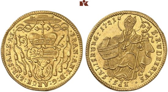 The Archbishopric of Salzburg was an ecclesiastical state between Bavaria and Austria and usually ruled by a Hapsburg client. This type was struck 1709-26 and is slightly more available than the ducat with the archbishop's bust (Fr-842). In the seventeenth century, Salzburg was blessed with a number of productive silver mines and the prince-archbishop was a prolific issuer of coins, particularly thalers. The archbishopric was secularized in 1803 and passed to Austria in 1813.