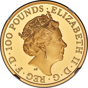This specimen was lot 33679 in Heritage sale 3114 (New York, January 2024), where it sold for $2,340. The lot description[1] noted, "Great Britain: Elizabeth II gold Proof "Yale of Beaufort" 100 Pounds (1 oz) 2023 PR70 Ultra Cameo NGC. Tudor Beasts series. First Releases. A pristine Proof, one of only twelve First Releases labeled awarded the highest technical grade at NGC." The yale is a mythical antelope with a boar's tusks and swiveling horns. Lady Margaret Beaufort (1443-1509), who used this beast on her arms, was Henry VII's mother.