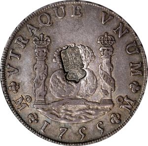 "PORTUGAL. Portugal - Mexico. 870 Reis, ND (1834). Maria II. PCGS AU-53. Countermark: AU Details. Issued by decree of 1 September 1834. Countermark: Crowned arms of Portugal within shaped indent. Applied to the obverse of a 1755-Mo MM Mexico "Pillar" 8 Reales of Ferdinand VI (KM-104.2). A great representative of the type, featuring an extremely elegant host, full of wondrous cabinet toning, and a well incised and well preserved countermark directly across the 'dos mundos.' Highly attractive, enticing and vastly superior than normally encountered."