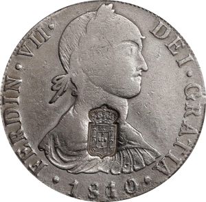 The first specimen is a Bolivian portrait eight reales of 1813 counterstamped in 1834 for circulation in Portugal. It was valued there at 870 réis. A wide variety of pesos served as hosts for this counterstamp; the SCWC lists 44 different undertypes and there are likely more. The one shown here is one of the common hosts. The second specimen was lot 22897 in Stack's Bowers ANA sale (Anaheim, CA, August 2016), where it sold for $211.50. The catalog description[1] noted, "PORTUGAL. 870 Reis, ND (1834). NGC VF Details--Excessive Surface Hairlines. Crowned Arms of Portugal countermarked on an 1801 Mexican 8 Reales. Cleaned, but with a crisp clear countermark. For the type, a very presentable example." The third specimen was lot 8669 in Stack's Bowers NYINC sale (New York, January 2022), where it sold for $312. The catalog description[2] noted,