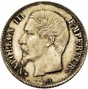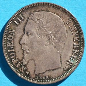 This issue, from the Paris mint, is a common date of a type struck 1853-63 during the régime of Napoleon III. This "tête nue" design, by J. J. Barre, was replaced in 1864 by the "tête laurée" type, which was of lower fineness. It was demonetized in 1869.