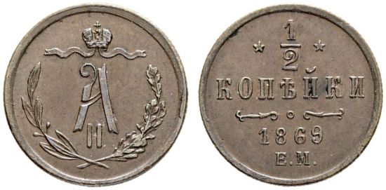 This specimen was lot 1820 in Sincona sale 63 (Zurich, June 2020), where it sold for 140 CHF (about US$176 including buyer's fees). The catalog description[1] noted, "RUSSIA | Russian Empire and Federation | Alexander II. 1855-1881, 1/2 Kopeck 1869, Ekaterinburg Mint, EM. Extremely fine." This type was struck 1867-81 at Ekaterinburg and St. Petersburg. Mintages are generally decent but the SCWC does not note the existence of any proofs. The half kopek or denga was the second lowest denomination Russian coin. The 4 g weight given by the SCWC is much too high.