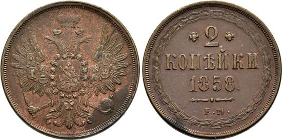 This type was struck 1850-60 at Ekaterinburg and Warsaw and is common in circulated condition. The type was slightly modified in 1859 and reduced in weight and the subsequent design (Y4a.1) was struck 1859-67. In 1867, the weight was reduced to 6.56 g.