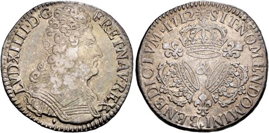 "FRANCE | Kingdom. Louis XIV. 1643-1715. 1/2 Ecu aux trois couronnes 1715 &, Aix. Sehr schön. (kingdom of France, Louis XIV, 1643-1715, half écu of the three crowns of 1715, Amiens mint. Very fine.)"
