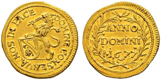 "Zurich | Stadt, Halbdukat 1677. Fast vorzüglich. (city of Zürich, half ducat of 1677. About extremely fine.)"