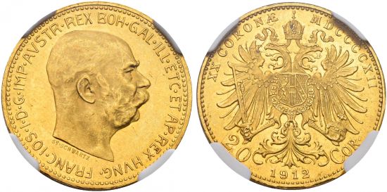 "HOLY ROMAN EMPIRE - AUSTRIA. Franz Joseph I. 1848-1916. 20 Kronen 1912, Wien. Schwartz. Selten. NGC MS63. (empire of Austria-Hungary, Francis Joseph I, 1848-1916, twenty korona of 1912, Vienna mint. Rare, graded NGC MS63.)"