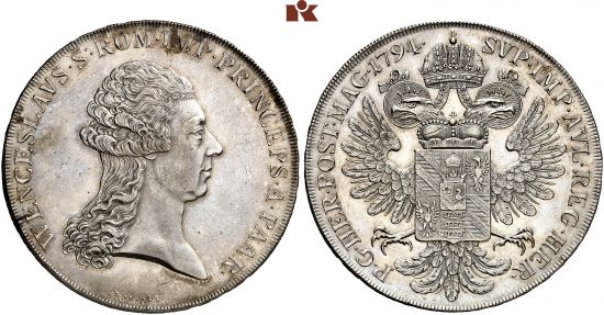 "RÖMISCH-DEUTSCHES REICH. DIE ÖSTERREICHISCHEN STANDESHERREN, PAAR, FÜRSTENTUM, Wenzel, 1792-1812. Konv.-Taler 1794, Wien. RR Nur 250 Exemplare geprägt. Feine Patina, winz. Schrötlingsfehler am Rand, vorzüglich +. (Holy Roman Empire, principality of Paar, Wenceslas, 1792-1812, convention thaler of 1794, Vienna mint. Rare, only 250 pieces struck, fine patina, edge bumps, extremely fine or better.)"