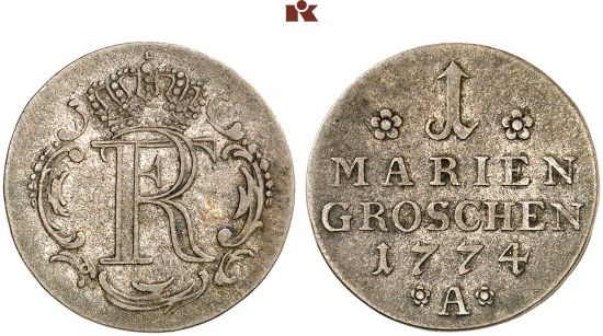 "BRANDENBURG-PREUSSEN, PREUSSEN, KÖNIGREICH, Friedrich II. der Große, 1740-1786. Mariengroschen 1774, A, Berlin. Prägung für die westlichen Landesteile. Sehr schön +. Exemplar der Auktion Berliner Münz-Cabinet 15, Berlin 1982, Nr. 682. (Germany, kingdom of Prussia, Frederick II the Great, 1740-86, mariengroschen of 1774, struck for the western provinces. Very fine or better.)"