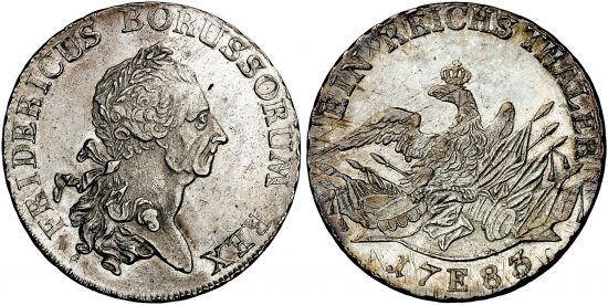 "PREUSSEN, KÖNIGREICH Friedrich II. der Große, 1740-1786. Reichstaler preuß. 1783, E, Königsberg. Leicht justiert, vorzüglich Exemplar der Slg. Bernhard Terletzki. (Germany, kingdom of Prussia, Frederick II (the Great), 1740-86, thaler of 1783, Königsberg mint. Light adjustment marks, extremely fine, from the Bernhard Terletzki collection)"