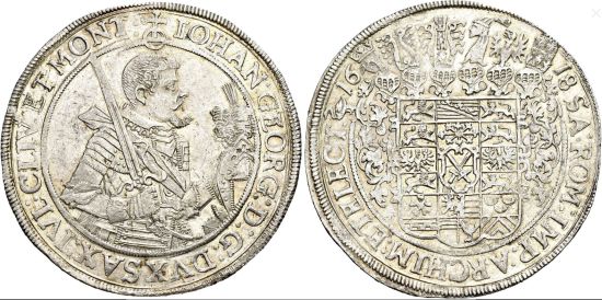 This specimen was lot 2620 in Sincona sale 83 (Zurich, May 2023), where it sold for 1,100 CHF (about US$1,472 including buyer's fees). The catalog description[1] noted, "Sachsen, Herzogtum, ab 1547 Kurfürstentum, Johann Georg I. 1615-1656. Taler 1618, Dresden. Selten in dieser Erhaltung (Rare in this condition). NGC MS63. Prachtvolle Erhaltung. Das durch NGC höchstbewertete Exemplar (Magnificent condition, Finest certified by NGC)." This type is listed for 1616-20 and is slightly scarcer than the preceding type (Dav-7573).